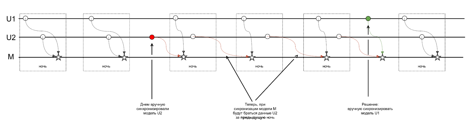 Если у вас есть цепочка моделей (U1 и U2 → M), и вы запускаете вручную только одну из родительских моделей (U2), то внутреннее расписание Airflow для зависимой модели (M) может “сбиться”.