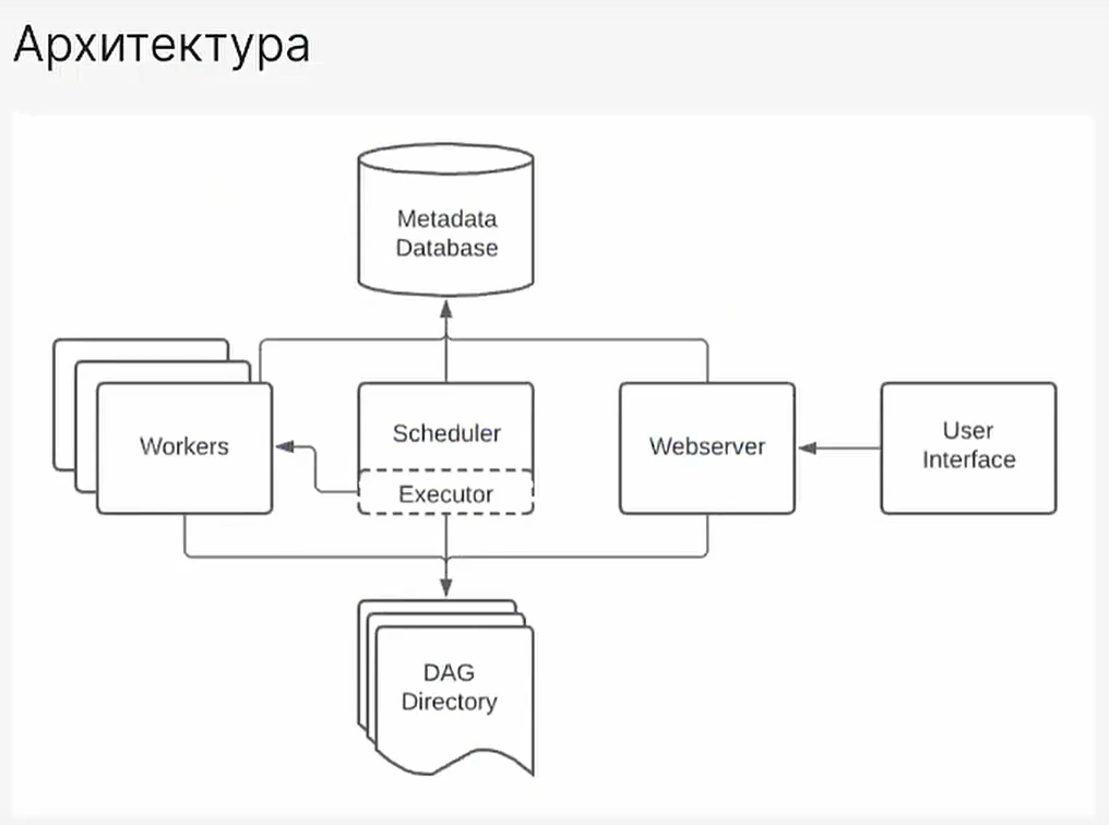 Airflow — это не единый механизм, а система, состоящая из нескольких ключевых компонентов, работающих вместе. Чтобы понять их роли, представьте систему Airflow как отдел логистики на большом складе: