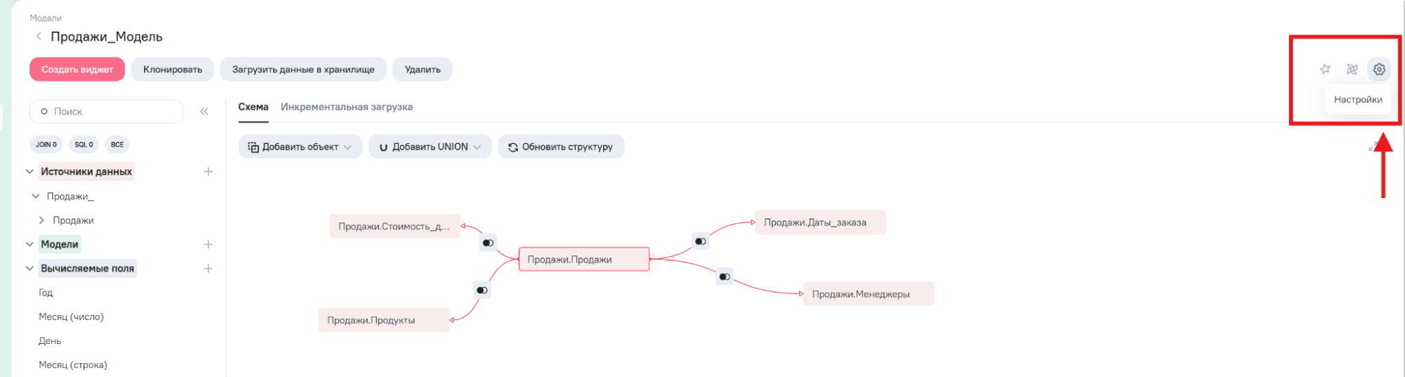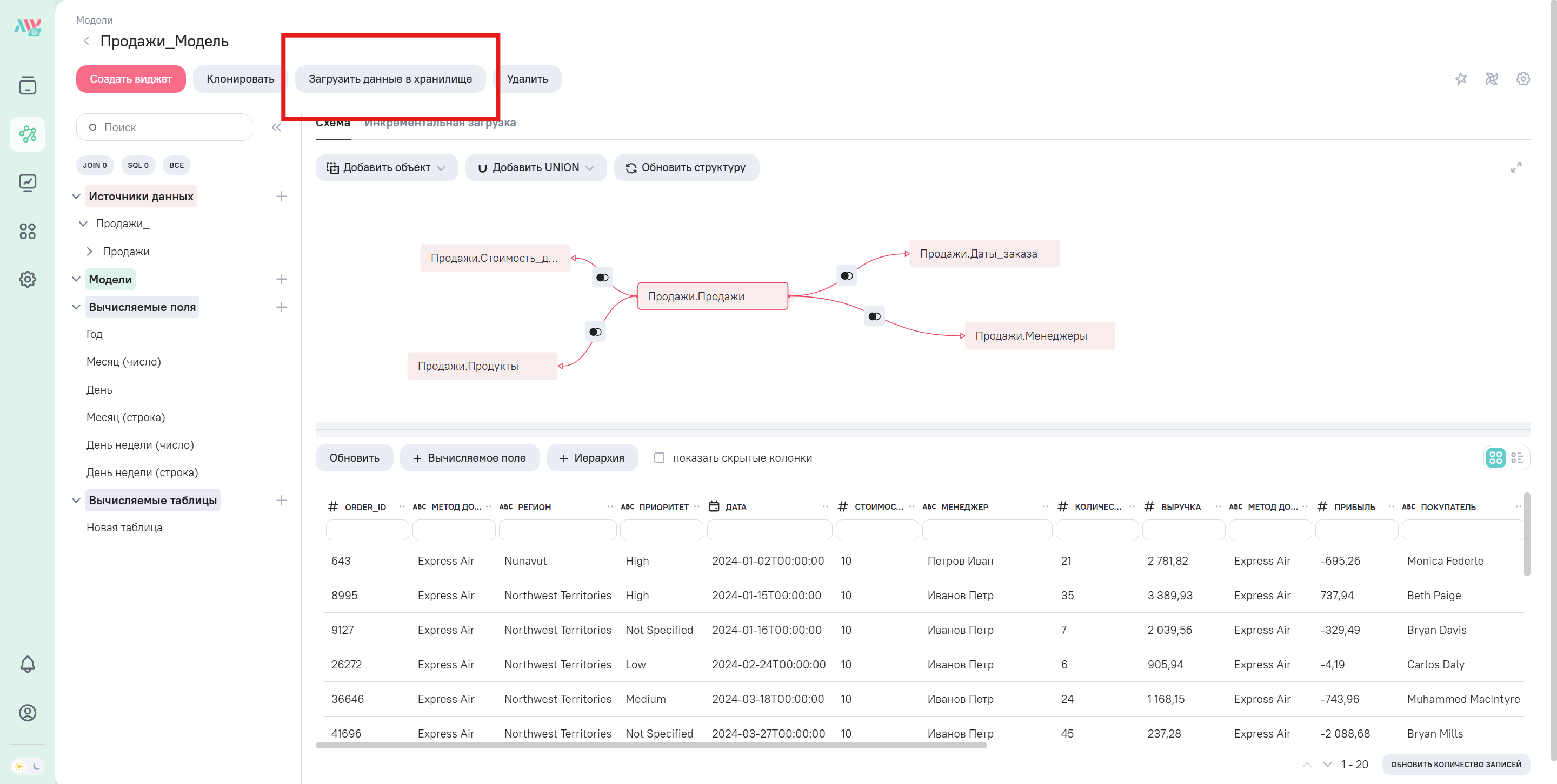 Вы можете запустить обновление модели в любой момент времени, нажав кнопку “Загрузить данные в хранилище”.