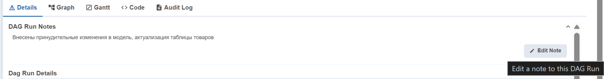 - Добавление метки к запуску. Вы можете добавить метку к конкретному запуску (DAG Run), чтобы не забыть о внесенных изменениях,например: “Внесены принудительные изменения в модель, актуализация таблицы товаров”.