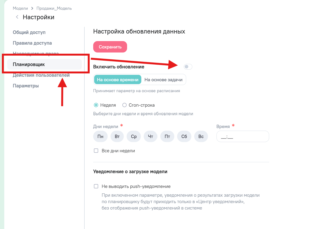 Настройки регулярного обновления доступны в разделе “Планировщик” в настройках модели. Для этого необходимо открыть панель “Настройки” в модели и перейти далее во вкладку “Планировщик”.