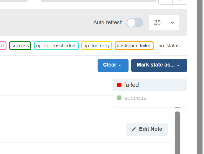- Остановка DAG: Если процесс завис или находится в цикле повторов, откройте Граф, нажмите на задачу и выберите Mark state as failed. Это остановит текущую задачу и предотвратит дальнейшие запуски.