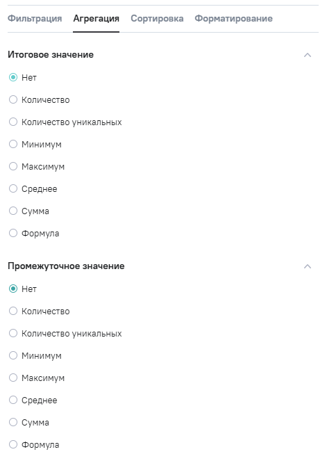 Также, есть возможность отключить расчет по итоговому и\или промежуточного значения, выбрав Нет в списке доступных функций, или выбрать Формула в списке и написать код формулы.